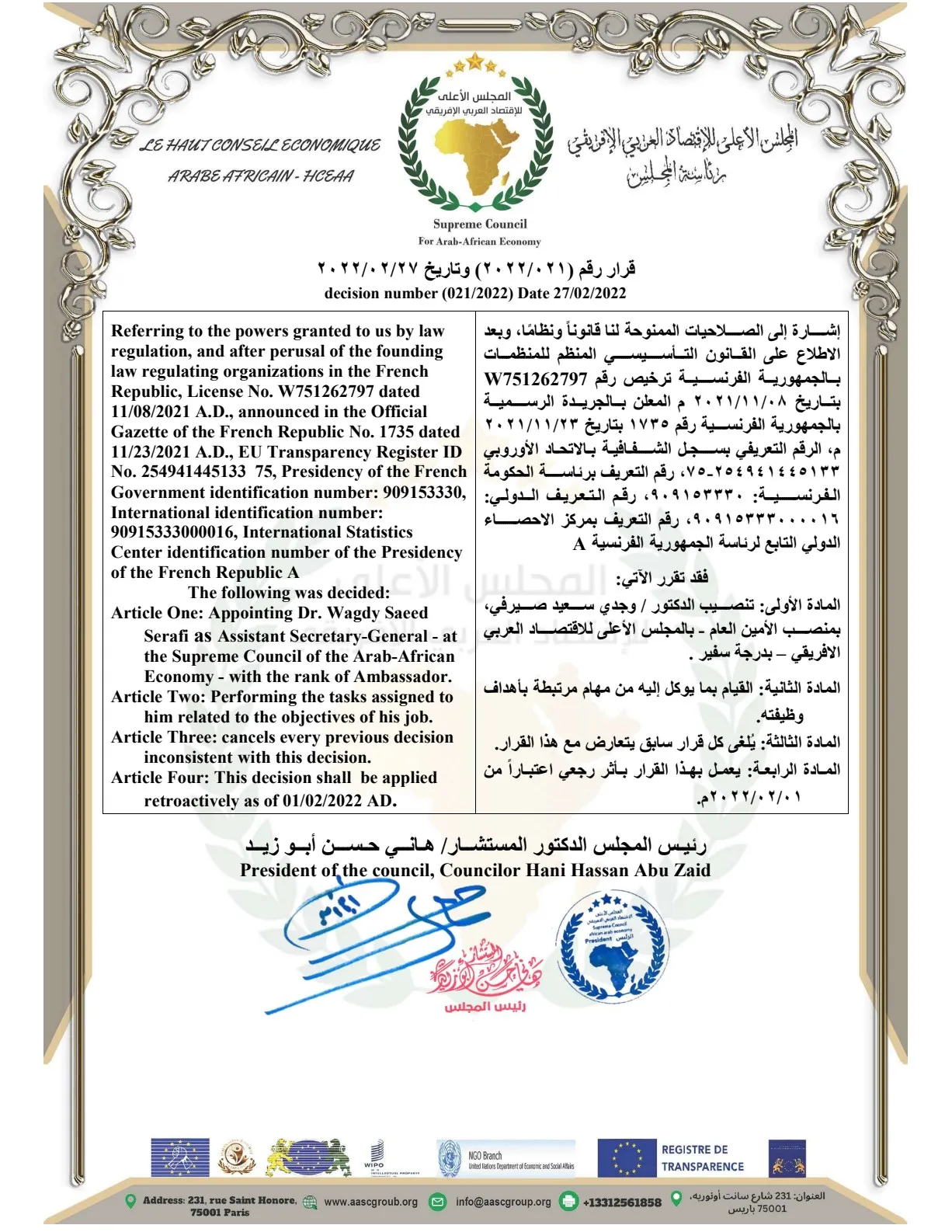 بمنصب الأمين العام المساعد – بالمجلس الأعلى للاقتصاد العربي الأفريقي – بدرجة سفير