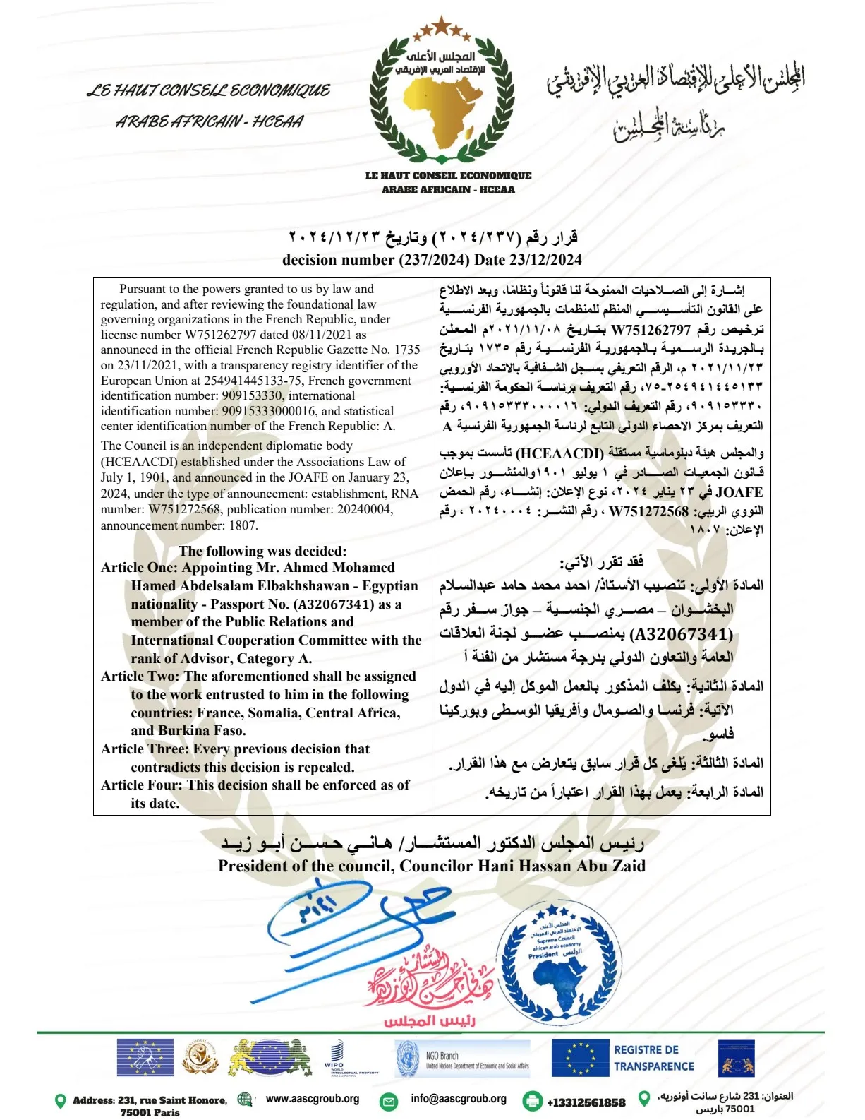 على القانون التأسيسي المنظم للمنظمات بالجمهورية الفرنسية من ترخيص رقم W751262797 بتاريخ 2021/11/08 م، المعلن بالجريدة الرسمية الفرنسية رقم 1735 بتاريخ 23/11/2021 م، الرقم التعريفي بسجل الشفافية بالاتحاد الأوروبي 254941445133-75، رقم التعريفي برئاسة الحكومة الفرنسية: 9091533300، رقم التعريف الدولي: 90915333000016، رقم A والمجلس هيئة دبلوماسية مستقلة (HCEAACDI) تأسست بموجب قانون الجمعيات الصادر في 1 يوليو 1901 م، ونموذج بإعلان في JOAFE بتاريخ 23 يناير 2024 م، نوع الإعلان: إنشاء، رقم الحمض النووي الربيعي: W751272568 ، رقم 20240004، رقم الإعلان: 1807.