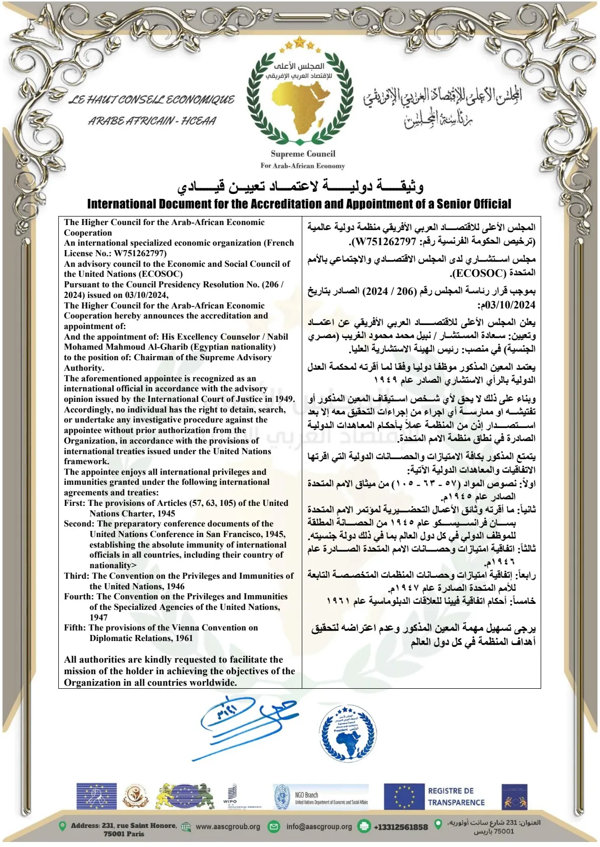 المجلس الأعلى للاقتصاد العربي الأفريقي منظمة دولية عالمية (ترخيص الحكومة الفرنسية رقم: W751262797).