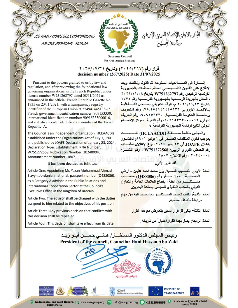 على القانون التأسيسي المنظم للمنظمات بالجمهورية الفرنسية من ترخيص رقم W751262797 بتاريخ 2021/11/08 م، المعلن بالجريدة الرسمية الفرنسية رقم 1735 بتاريخ 23/11/2021 م، الرقم التعريفي بسجل الشفافية بالاتحاد الأوروبي 254941445133-75، رقم التعريفي برئاسة الحكومة الفرنسية: 9091533300، رقم التعريف الدولي: 90915333000016، رقم A والمجلس هيئة دبلوماسية مستقلة (HCEAACDI) تأسست بموجب قانون الجمعيات الصادر في 1 يوليو 1901 م، ونموذج بإعلان في JOAFE بتاريخ 23 يناير 2024 م، نوع الإعلان: إنشاء، رقم الحمض النووي الربيعي: W751272568 ، رقم 20240004، رقم الإعلان: 1807.