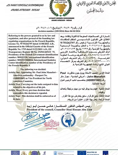 على القانون التأسيسي المنظم للمنظمات بالجمهورية الفرنسية من ترخيص رقم W751262797 بتاريخ 2021/11/08 م، المعلن بالجريدة الرسمية الفرنسية رقم 1735 بتاريخ 23/11/2021 م، الرقم التعريفي بسجل الشفافية بالاتحاد الأوروبي 254941445133-75، رقم التعريفي برئاسة الحكومة الفرنسية: 9091533300، رقم التعريف الدولي: 90915333000016، رقم A والمجلس هيئة دبلوماسية مستقلة (HCEAACDI) تأسست بموجب قانون الجمعيات الصادر في 1 يوليو 1901 م، ونموذج بإعلان في JOAFE بتاريخ 23 يناير 2024 م، نوع الإعلان: إنشاء، رقم الحمض النووي الربيعي: W751272568 ، رقم 20240004، رقم الإعلان: 1807.