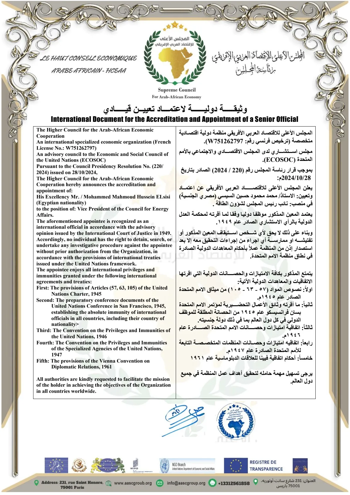 يعلن المجلس الأعلى للاقتصاد العربي الأفريقي عن اعتماد وتعيين: الاستاذ / محمد محمود حسين السيسي (مصري الجنسية) في منصب: نائب رئيس المجلس لشؤون الطاقة.